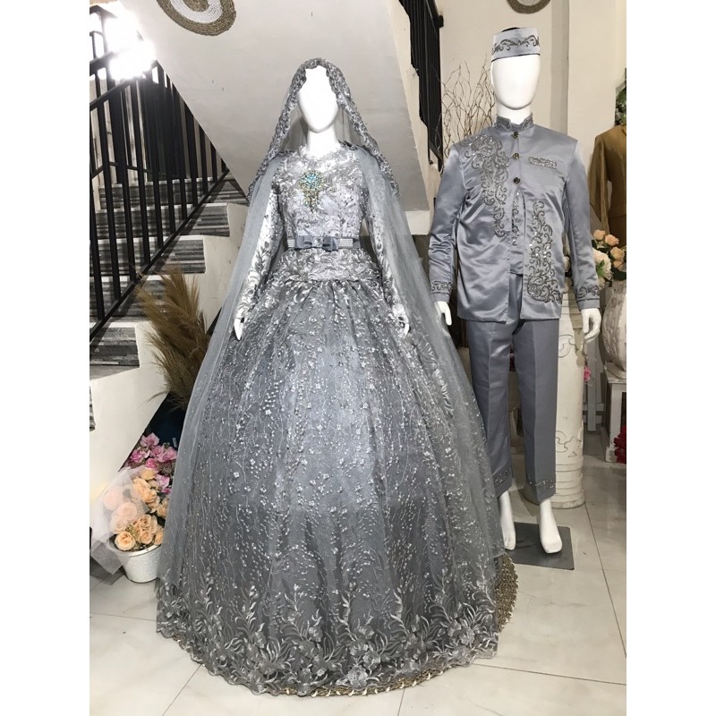 Baju gaun pengantin warna abu abu silver tua lengan trompet wedding dress full.